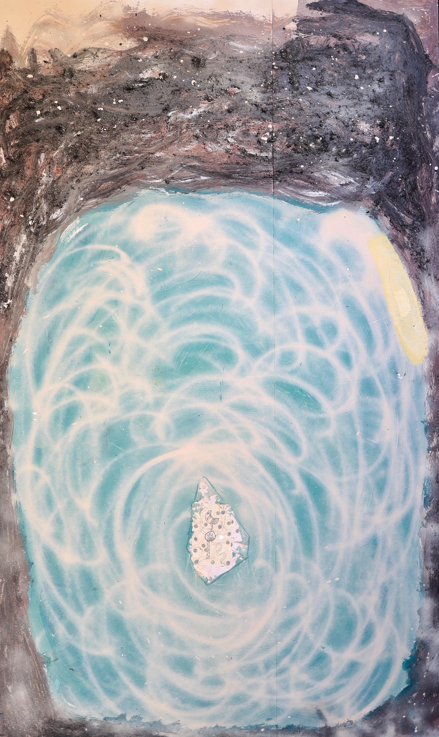 Acrylic spray paint, acrylic, pastel, & turmeric on canvas